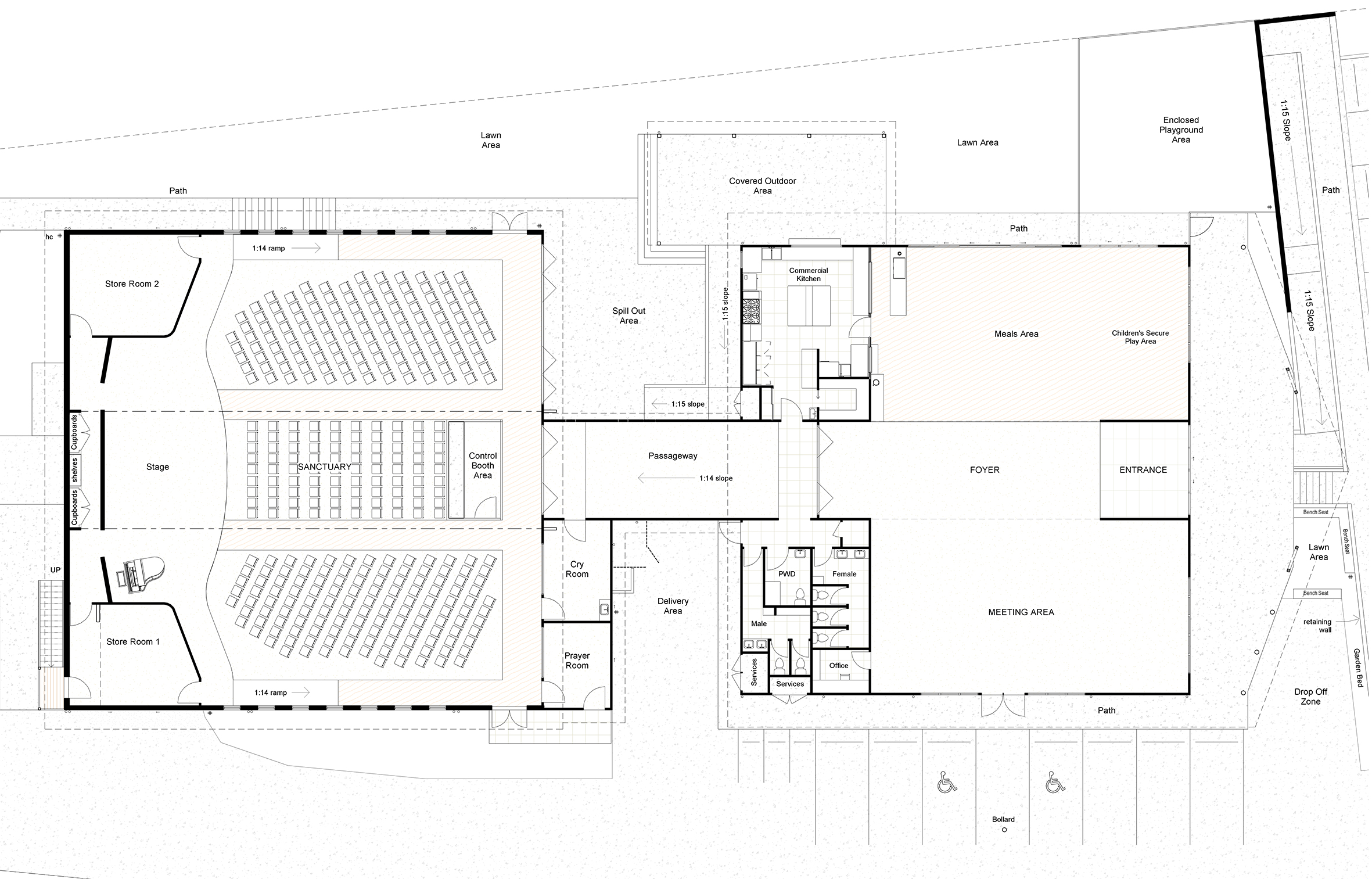 Devine Design, Gympie Drawings The congregation has outgrown their current space and is looking to expand. This beautiful and functional design is simply waiting for the funds and people to make it a reality. Existing site Back to Projects
